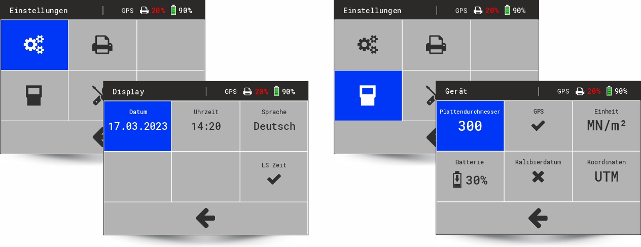 Die Sollwerte der Messpunkte für den Statischen Plattendruckversuch nach DIN 18134 sind im Messgerät hinterlegt und werden in der obersten Zeile angezeigt.
